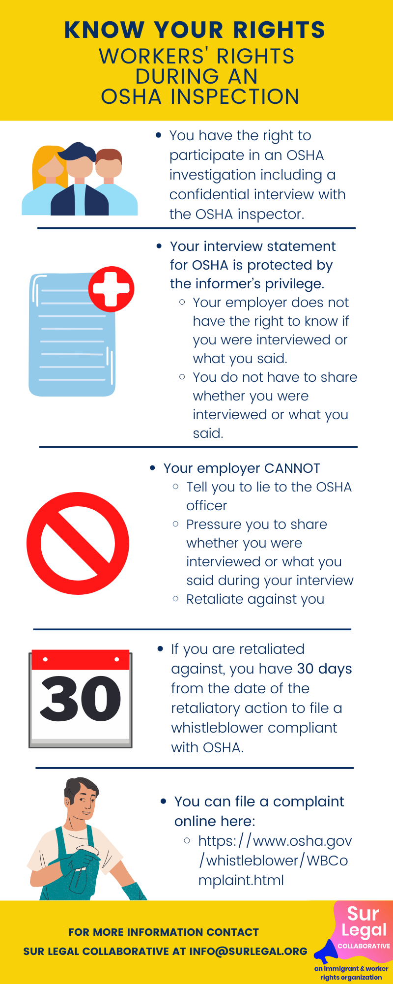 In January 2021, Sur joined a rapid response effort after a toxic nitrogen leak killed 6 poultry workers and injured several more at Foundation Food Group in Gainesville, Georgia, the so-called "poultry capital of the world." Poultry workers in Georgia are predominantly immigrants and face some of harshest immigration laws and most unsafe workplace conditions in the country. Sur's rapid response work has included providing a relevant KYR presentation on the day of the nitrogen leak, which received over 9,000 views; co-hosting a clinic four days after the leak to screen the workers for labor violations; representing several of the workers through the OSHA investigation process including filing OSHA complaints on behalf of a group of workers; creating KYR infographics for workers about their rights and sending them to workers; co-hosting an immigration clinic; and advocating for and shepherding the process of applying for Deferred Action, which provides a temporary immigration status--a critical protection--for undocumented workers involved in labor disputes.